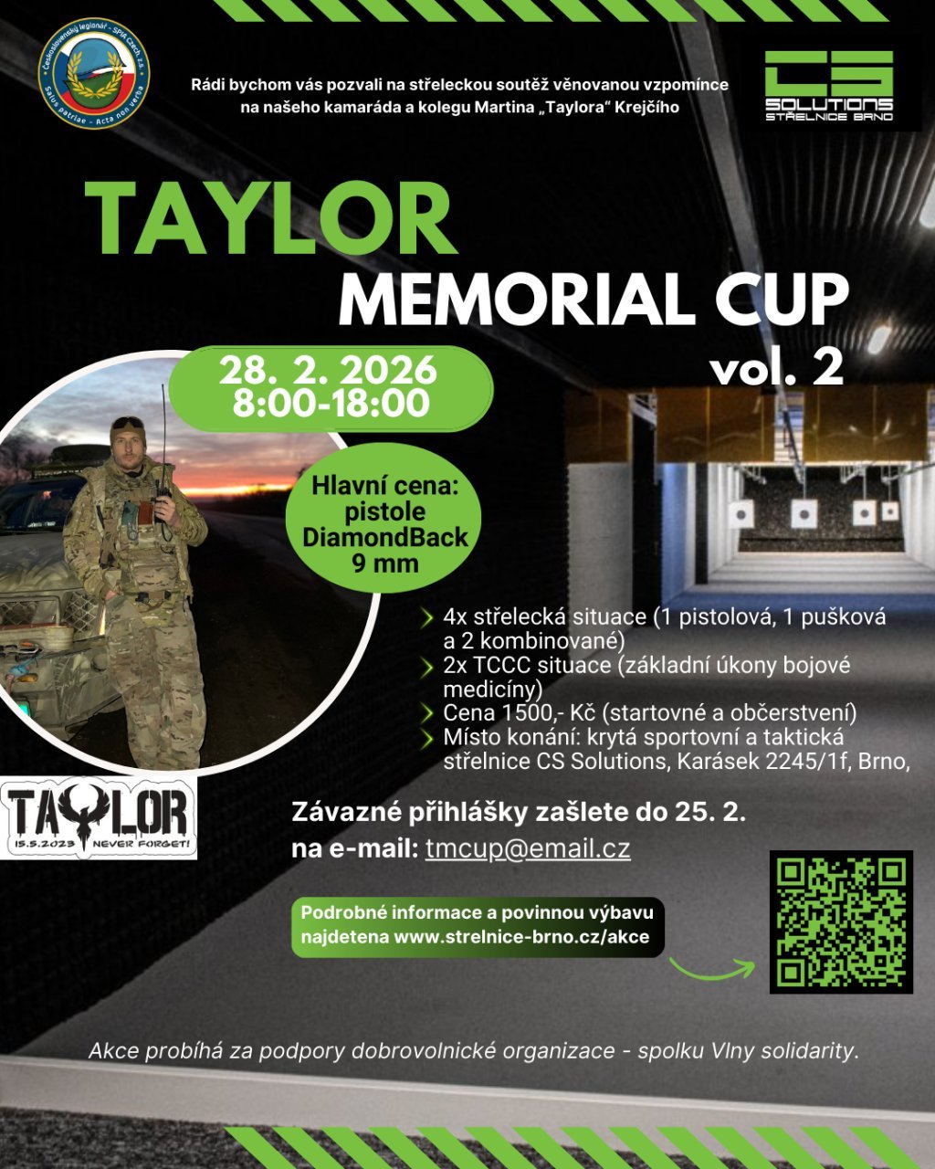 Střelecká soutěž věnovaná památce Martina ,,Taylora,, Krejčího, brněnského rodáka, který utrpěl smrtelné zranění během války v Ukrajině, kde působil dobrovolně jako instruktor taktické medicíny. Za život mu kromě stovek proškolených mužů a žen vděčí i desítky těch, které evakuoval přímo z frontové linie. Jeho obětavé nasazení se mu stalo osudným u městečka Kremnina v Luhanské oblasti, kde při jedné z evakuací po zásahu střepinou do hlavy upadl do bezvědomí. Po několika operacích na území Ukrajiny i Čech, kam se jej podařilo později transportovat, však zemřel. Jeho příběh žije dál v srdcích rodiny a přátel.